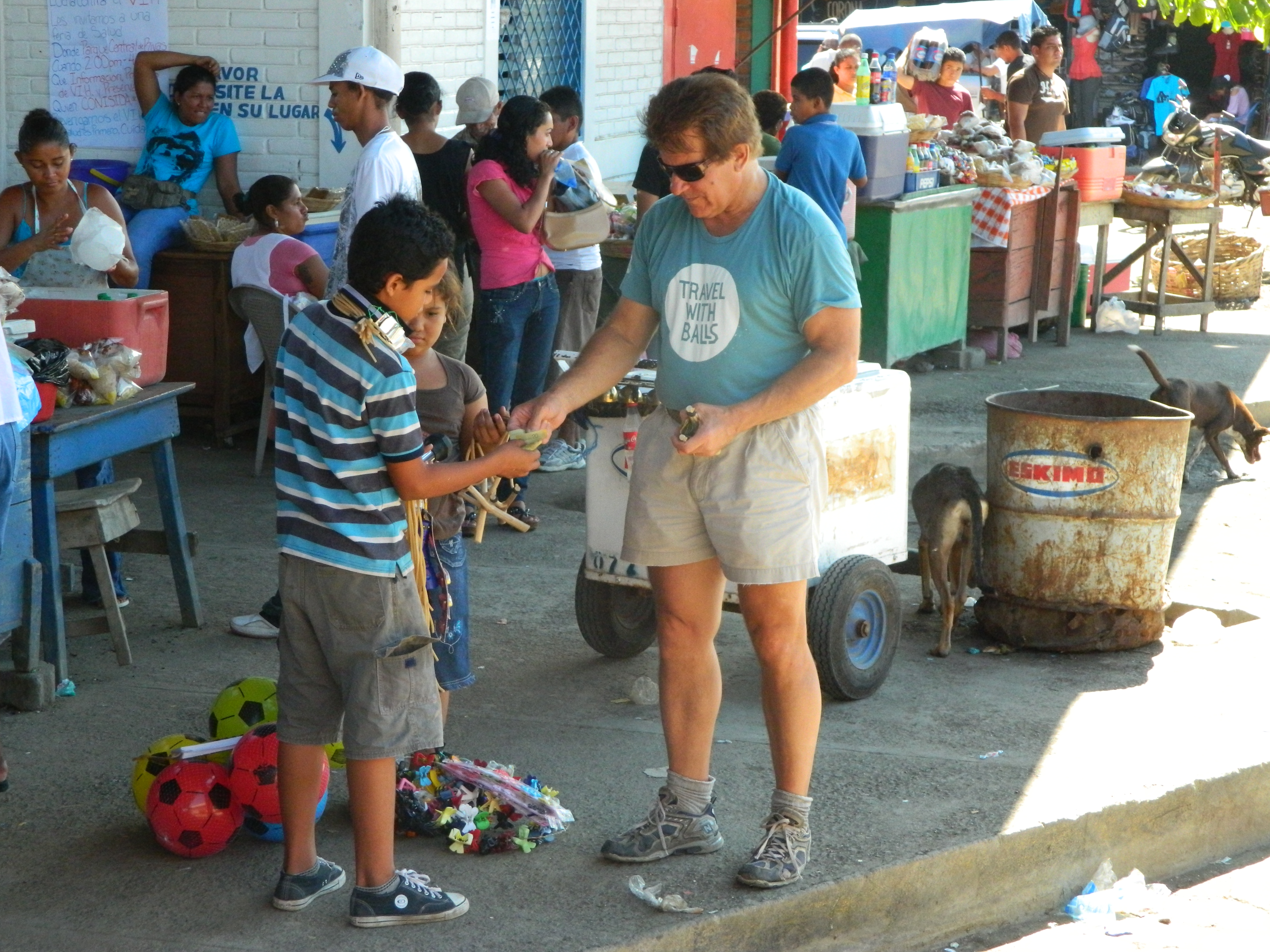 On our last day in Nicaragua, a young boy and his even younger sister walked the aisle of our local bus that was waiting to attract a few more passengers before it took off; the kids were trying to sell brightly colored clay whistles and wooden slingshots. When there were no takers they got off the bus and slowly trudged away, looking dejected. William is a real softie so he leaped out after them and bought one of the slingshots for a buck. (See picture above) I’m not sure who was more delighted by the transaction, the children or my beloved. He returned to the bus with a huge grin on his face, waving the slingshot and declaring that he had been pretty good with one as a youngster, maybe he would reclaim his ability.