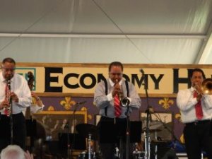 Wendell Brunious & The Jazz Masters at the Economy Hall Jazz Tent. The traditional jazz that put New Orleans on the musical map isn’t much in vogue these days — this venue that features Dixieland brass bands and ragtime is among the smallest at Jazz Fest — but the music has lost none of its power or punch for its aficionados. Brunious, a handsome, dapper trumpeter who has been around for decades, teamed up with Dr. Michael White — a walking encyclopedia of traditional jazz and a virtuoso clarinetist — and a host of other old-time professionals to deliver a spirited set that set dozens of folks to second-lining almost from the start. Once the trumpets and trombones were wailing out came the parasols and the hankies and the aisles filled with happy dancers waving both around as they strutted through the tent. I was one of them. I must have looked pretty funny in my Travel With Balls t-shirt, jauntily snapping my bandanna in the air to the rhythms as sweat poured down my face and a maniacal, ear-to-ear grin of ecstasy showed off every last one of my upper teeth…